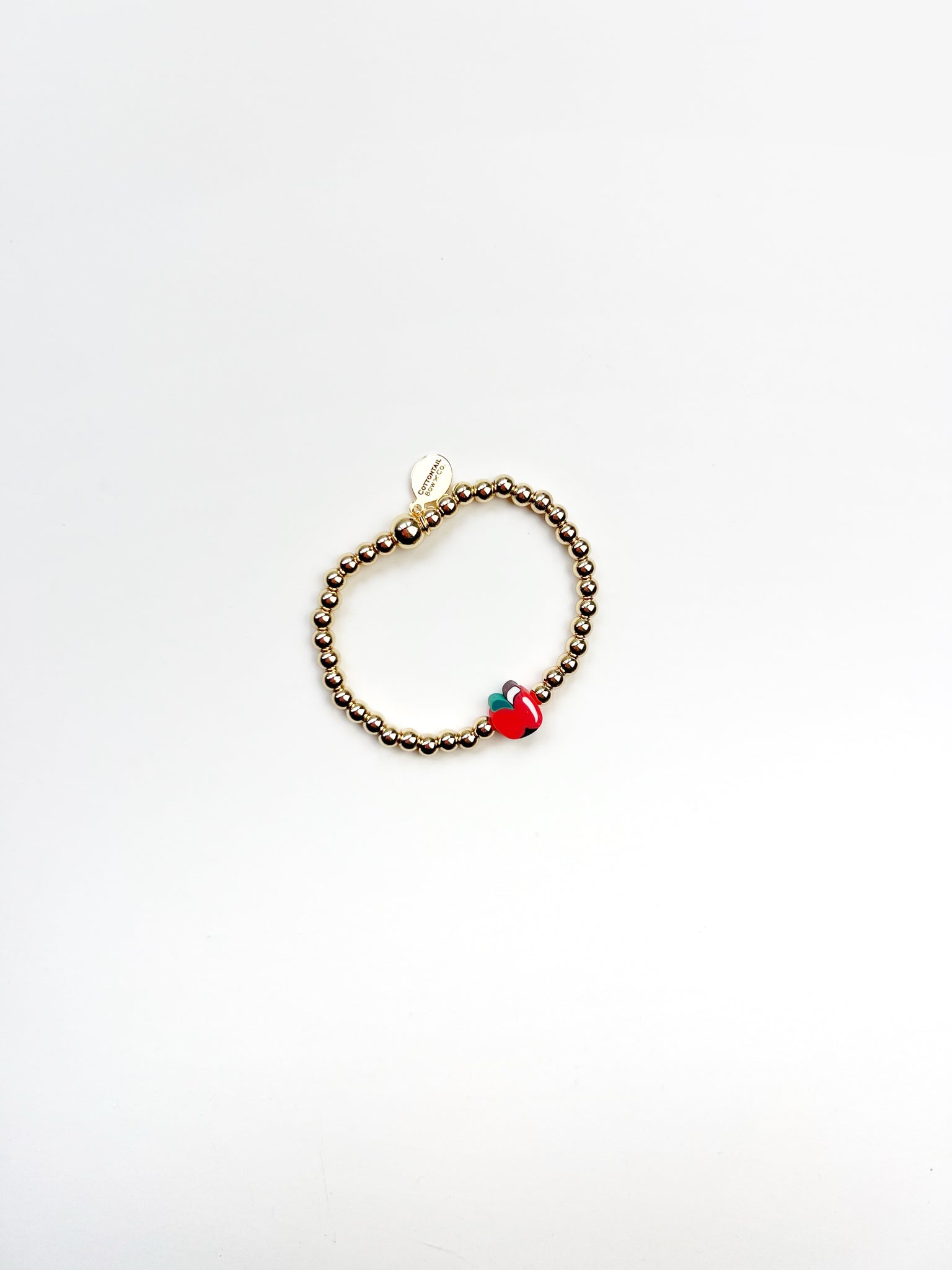 Materials: stretch cord, gold/silver plated plated 4mm beads, apple bead, gold/silver plated logo tag