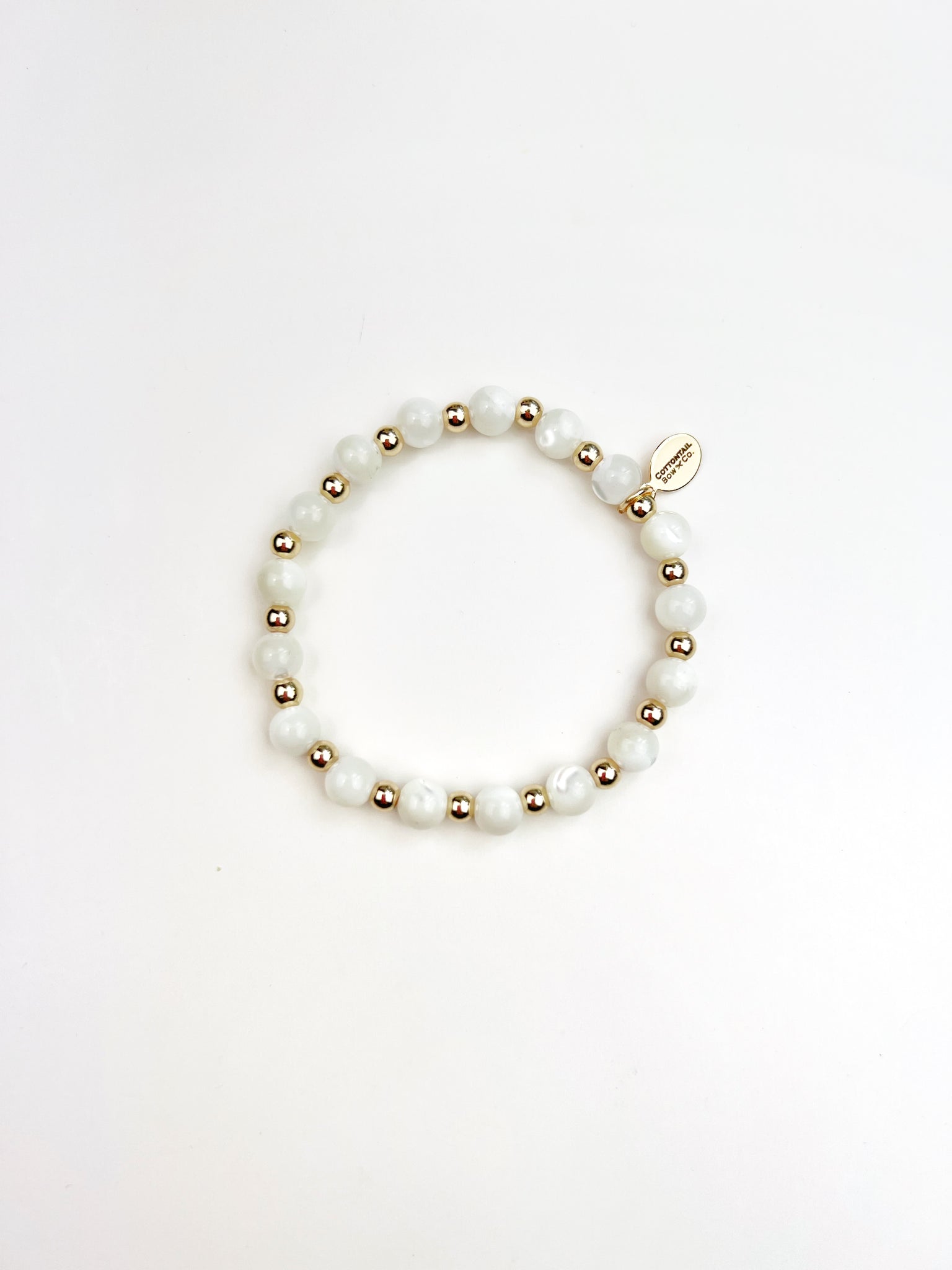 Materials: stretch cord, mother of pearl beads, gold/silver plated beads, gold/silver plated heart bead, gold/silver plated logo tag